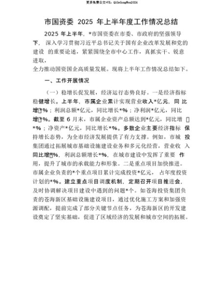【七哥公文】2025年:【七哥公文】市国资委2025年上半年度工作情况总结+更多免费公文+VX:QiGeGongWen2024+更多免费公文+VX:QiGeGongWen2024