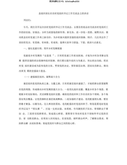 【七哥公文】2025年:【七哥公文】县组织部长在农村X组织书记工作交流会上的讲话+更多免费公文+VX:QiGeGongWen2024+更多免费公文+VX:QiGeGongWen2024