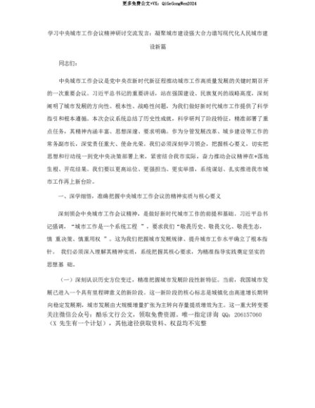 【七哥公文】2025年:【七哥公文】学习中央城市工作会议精神研讨交流发言:凝聚城市建设强大合力 谱写现代化人民城市建设新篇+更多免费公文+VX:QiGeGongWen2024+更多免费公文+VX:QiGeGongWen2024