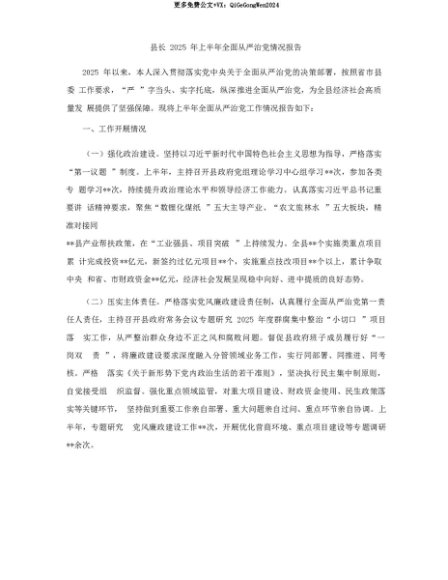 【七哥公文】2025年:【七哥公文】县长2025年上半年全面从严治X情况报告+更多免费公文+VX:QiGeGongWen2024+更多免费公文+VX:QiGeGongWen2024