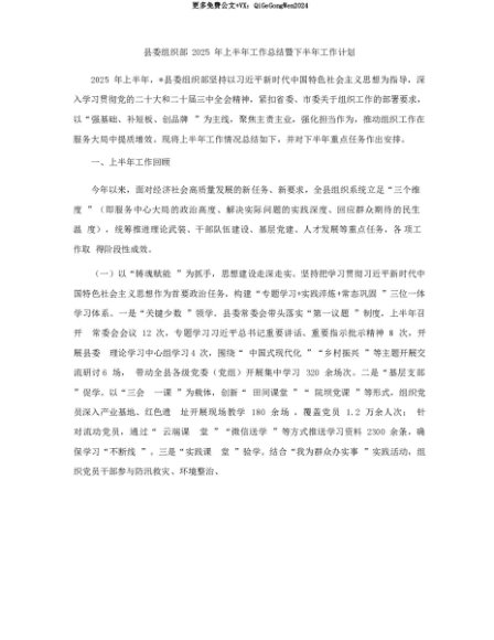 【七哥公文】2025年:【七哥公文】县委组织部2025年上半年工作总结暨下半年工作计划+更多免费公文+VX:QiGeGongWen2024+更多免费公文+VX:QiGeGongWen2024