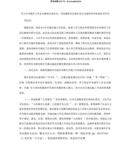 【七哥公文】2025年:【七哥公文】学习中央城市工作会议精神交流发言:在构建现代化城市综合交通体系中彰显担当作为+更多免费公文+VX:QiGeGongWen2024+更多免费公文+VX:QiGeGongWen2024