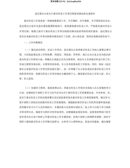 【七哥公文】2025年:【七哥公文】县纪委办公室关于意识形态工作责任制落实情况的自查报告+更多免费公文+VX:QiGeGongWen2024+更多免费公文+VX:QiGeGongWen2024