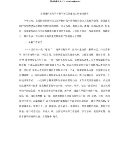 【七哥公文】2025年:【七哥公文】县委组织部关于年轻干部队伍建设工作情况报告+更多免费公文+VX:QiGeGongWen2024+更多免费公文+VX:QiGeGongWen2024