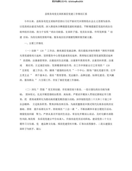 【七哥公文】2025年:【七哥公文】县税务局X支部抓基层X建工作情况汇报+更多免费公文+VX:QiGeGongWen2024+更多免费公文+VX:QiGeGongWen2024