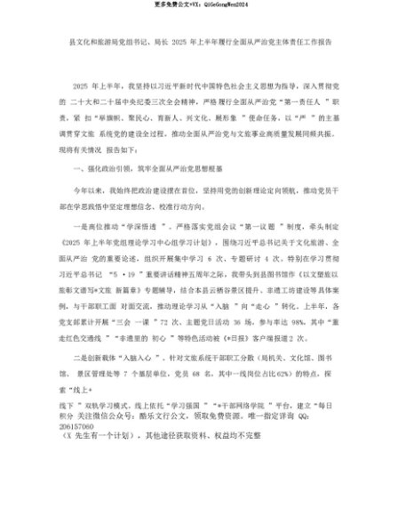 【七哥公文】2025年:【七哥公文】县文化和旅游局X组书记、局长2025年上半年履行全面从严治X主体责任工作报告+更多免费公文+VX:QiGeGongWen2024+更多免费公文+VX:QiGeGongWen2024