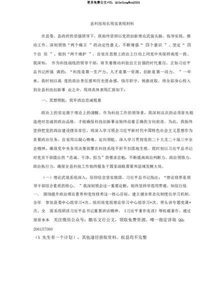 【七哥公文】2025年:【七哥公文】县科技局长现实表现材料+更多免费公文+VX:QiGeGongWen2024+更多免费公文+VX:QiGeGongWen2024