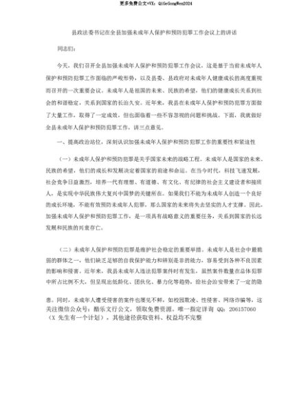 【七哥公文】2025年:【七哥公文】县政法委书记在全县加强未成年人保护和预防犯罪工作会议上的讲话+更多免费公文+VX:QiGeGongWen2024+更多免费公文+VX:QiGeGongWen2024