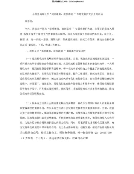 【七哥公文】2025年:【七哥公文】县税务局局长在“提质增效,狠抓落实”专题X委扩大会上的讲话+更多免费公文+VX:QiGeGongWen2024+更多免费公文+VX:QiGeGongWen2024