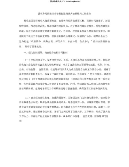 【七哥公文】2025年:【七哥公文】县税务局推进综合治税打造精诚共治新格局工作报告+更多免费公文+VX:QiGeGongWen2024+更多免费公文+VX:QiGeGongWen2024