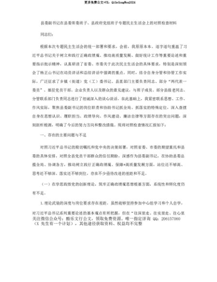 【七哥公文】2025年:【七哥公文】县委副书记在县委常委班子、县政府X组班子专题民主生活会上的对照检查材料+更多免费公文+VX:QiGeGongWen2024+更多免费公文+VX:QiGeGongWen2024