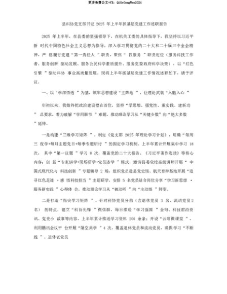 【七哥公文】2025年:【七哥公文】县科协X支部书记2025年上半年抓基层X建工作述职报告+更多免费公文+VX:QiGeGongWen2024+更多免费公文+VX:QiGeGongWen2024
