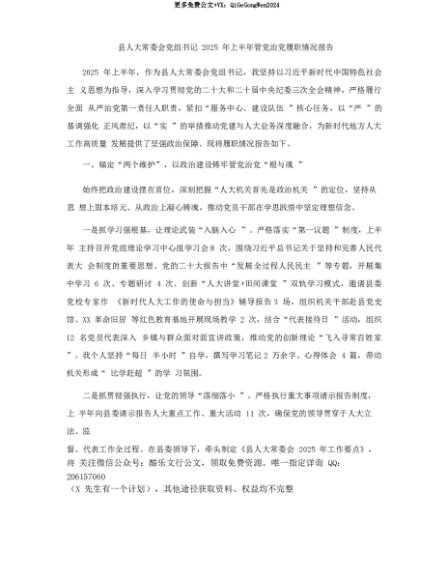 【七哥公文】2025年:【七哥公文】县人大常委会X组书记2025年上半年管X治X履职情况报告+更多免费公文+VX:QiGeGongWen2024+更多免费公文+VX:QiGeGongWen2024