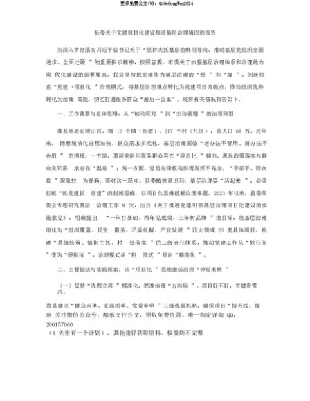 【七哥公文】2025年:【七哥公文】县委关于X建项目化建设推进基层治理情况的报告+更多免费公文+VX:QiGeGongWen2024+更多免费公文+VX:QiGeGongWen2024