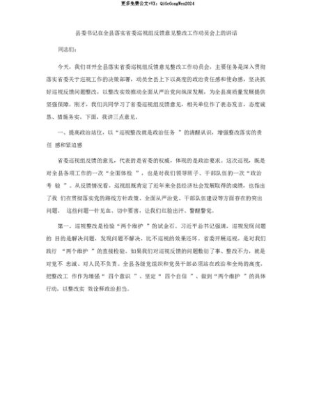 【七哥公文】2025年:【七哥公文】县委书记在全县落实省委巡视组反馈意见整改工作动员会上的讲话+更多免费公文+VX:QiGeGongWen2024+更多免费公文+VX:QiGeGongWen2024