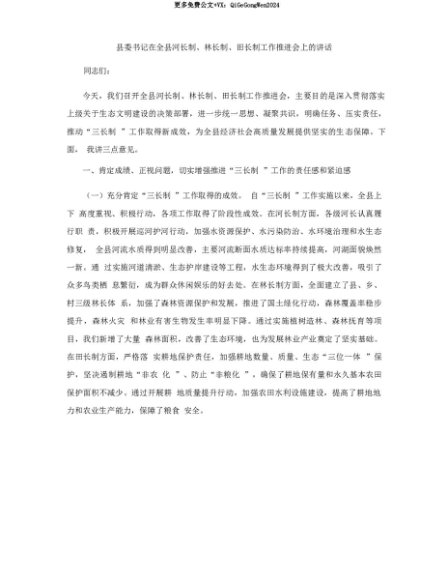 【七哥公文】2025年:【七哥公文】县委书记在全县河长制、林长制、田长制工作推进会上的讲话+更多免费公文+VX:QiGeGongWen2024+更多免费公文+VX:QiGeGongWen2024