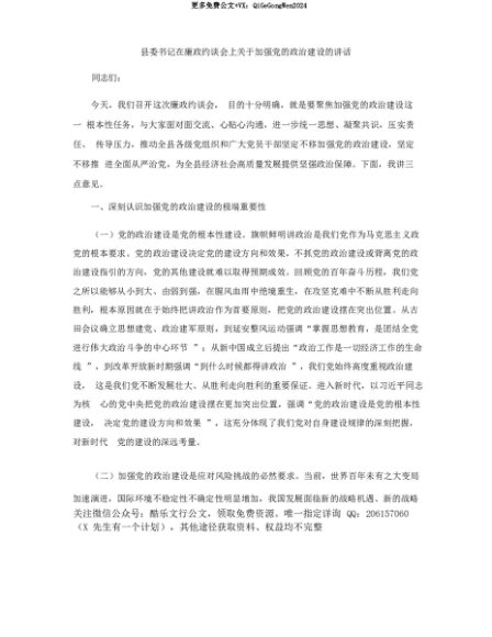 【七哥公文】2025年:【七哥公文】县委书记在廉政约谈会上关于加强X的ZZ建设的讲话+更多免费公文+VX:QiGeGongWen2024+更多免费公文+VX:QiGeGongWen2024