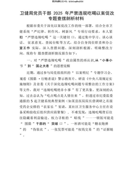 【七哥公文】2025年:【七哥公文】卫健局X员干部2025年严禁违规吃喝以案促改专题查摆剖析材料+更多免费公文+VX:QiGeGongWen2024+更多免费公文+VX:QiGeGongWen2024