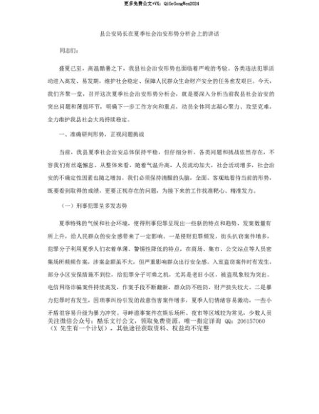 【七哥公文】2025年:【七哥公文】县公安局长在夏季社会治安形势分析会上的讲话+更多免费公文+VX:QiGeGongWen2024+更多免费公文+VX:QiGeGongWen2024