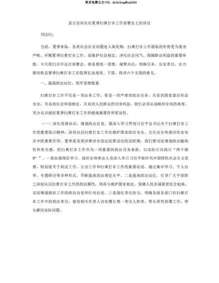 【七哥公文】2025年:【七哥公文】县公安局长在夏季扫黄打非工作部署会上的讲话+更多免费公文+VX:QiGeGongWen2024+更多免费公文+VX:QiGeGongWen2024