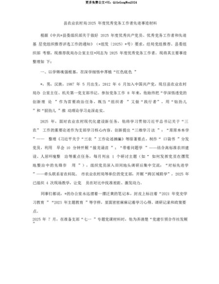 【七哥公文】2025年:【七哥公文】县农业农村局2025年度优秀X务工作者先进事迹材料+更多免费公文+VX:QiGeGongWen2024+更多免费公文+VX:QiGeGongWen2024