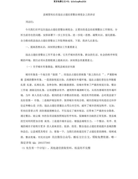 【七哥公文】2025年:【七哥公文】县XX局长在违法占道经营整治调度会上的讲话+更多免费公文+VX:QiGeGongWen2024+更多免费公文+VX:QiGeGongWen2024