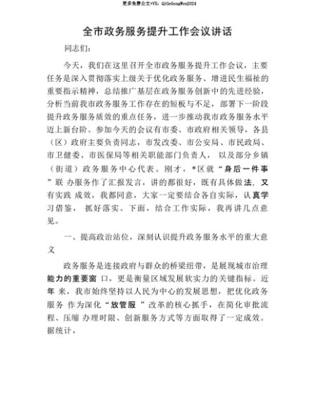【七哥公文】2025年:【七哥公文】全市政务服务提升工作会议讲话+更多免费公文+VX:QiGeGongWen2024+更多免费公文+VX:QiGeGongWen2024