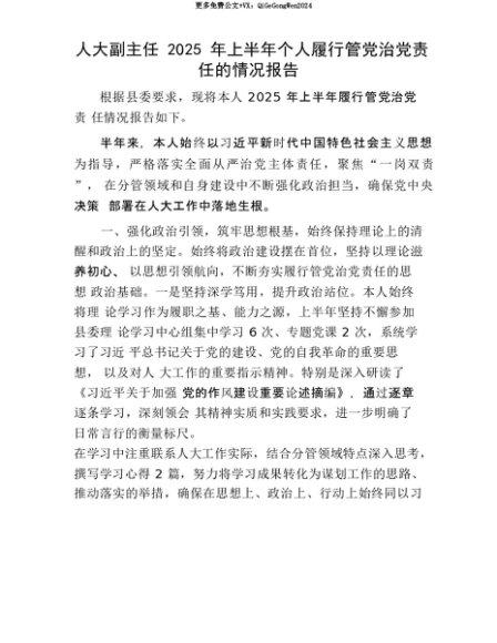 【七哥公文】2025年:【七哥公文】人大副主任2025年上半年个人履行管X治X责任的情况报告+更多免费公文+VX:QiGeGongWen2024+更多免费公文+VX:QiGeGongWen2024