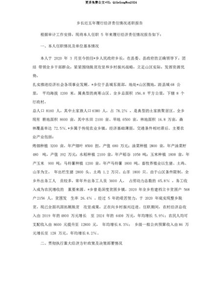 【七哥公文】2025年:【七哥公文】乡长近五年履行经济责任情况述职报告+更多免费公文+VX:QiGeGongWen2024+更多免费公文+VX:QiGeGongWen2024
