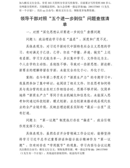 【七哥公文】2025年:【七哥公文】领导干部对照“五个进一步到位”问题查摆清单+更多免费公文+VX:QiGeGongWen2024+更多免费公文+VX:QiGeGongWen2024