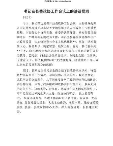 【七哥公文】2025年:【七哥公文】书记在县委政协工作会议上的讲话提纲+更多免费公文+VX:QiGeGongWen2024+更多免费公文+VX:QiGeGongWen2024