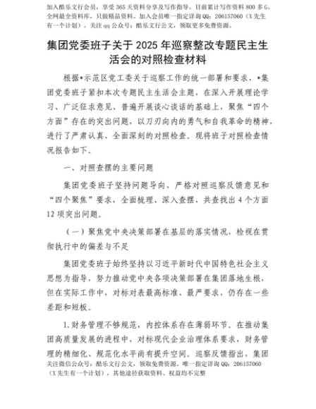 【七哥公文】2025年:【七哥公文】集团X委班子关于2025年巡察整改专题民主生活会的对照检查材料+更多免费公文+VX:QiGeGongWen2024+更多免费公文+VX:QiGeGongWen2024