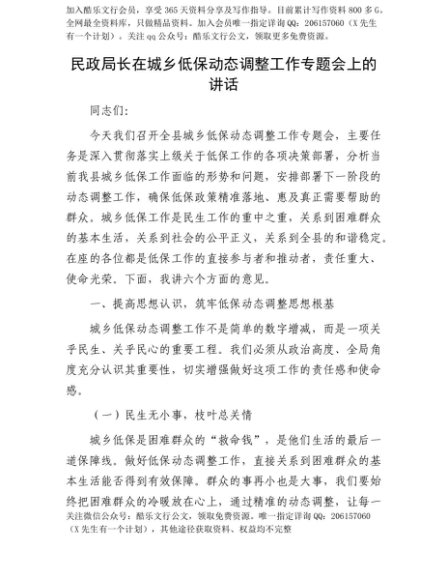 【七哥公文】2025年:【七哥公文】民政局长在城乡低保动态调整工作专题会上的讲话+更多免费公文+VX:QiGeGongWen2024+更多免费公文+VX:QiGeGongWen2024
