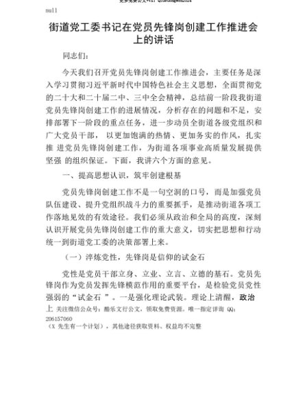 【七哥公文】2025年:【七哥公文】街道X工委书记在X员先锋岗创建工作推进会上的讲话+更多免费公文+VX:QiGeGongWen2024+更多免费公文+VX:QiGeGongWen2024