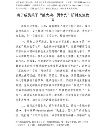 【七哥公文】2025年:【七哥公文】班子成员关于“挑大梁、勇争先”研讨交流发言+更多免费公文+VX:QiGeGongWen2024+更多免费公文+VX:QiGeGongWen2024