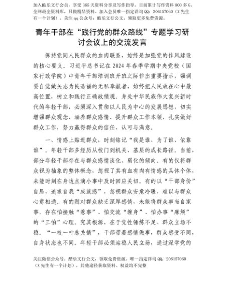 【七哥公文】2025年:【七哥公文】青年干部在“践行X的群众路线”专题学习研讨会议上的交流发言+更多免费公文+VX:QiGeGongWen2024+更多免费公文+VX:QiGeGongWen2024