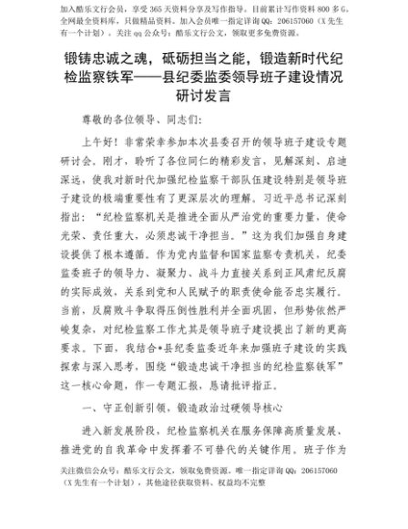【七哥公文】2025年:【七哥公文】锻铸忠诚之魂,砥砺担当之能,锻造新时代纪检监察铁军——县纪委监委领导班子建设情况研讨发言+更多免费公文+VX:QiGeGongWen2024+更多免费公文+VX:QiGeGongWen2024