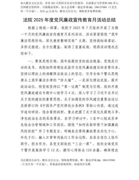【七哥公文】2025年:【七哥公文】法院2025年度X风廉政宣传教育月活动总结+更多免费公文+VX:QiGeGongWen2024+更多免费公文+VX:QiGeGongWen2024