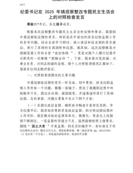 【七哥公文】2025年:【七哥公文】纪委书记在2025年镇巡察整改专题民主生活会上的对照检查发言+更多免费公文+VX:QiGeGongWen2024+更多免费公文+VX:QiGeGongWen2024