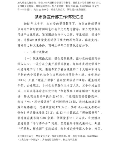 【七哥公文】2025年:【七哥公文】某市委宣传部工作情况汇报+更多免费公文+VX:QiGeGongWen2024+更多免费公文+VX:QiGeGongWen2024
