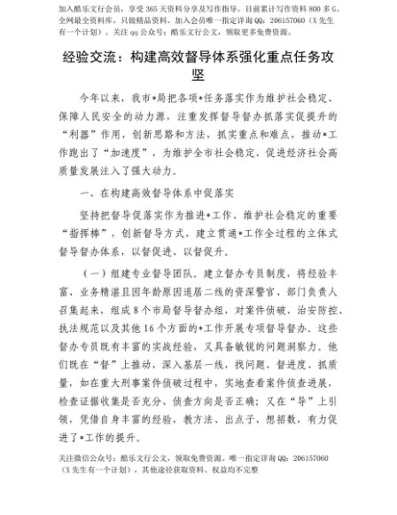 【七哥公文】2025年:【七哥公文】经验交流: 构建高效督导体系 强化重点任务攻坚+更多免费公文+VX:QiGeGongWen2024+更多免费公文+VX:QiGeGongWen2024