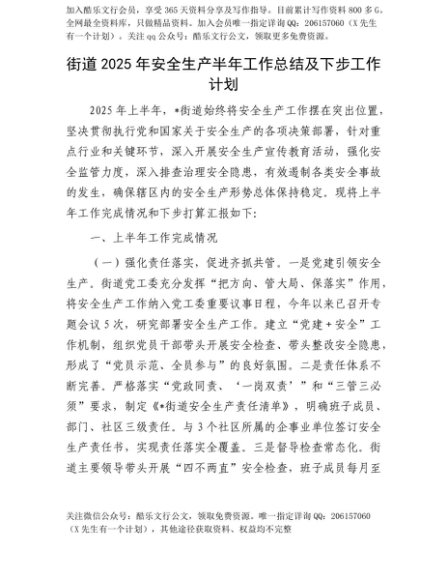 【七哥公文】2025年:【七哥公文】街道2025年安全生产半年工作总结及下步工作计划+更多免费公文+VX:QiGeGongWen2024+更多免费公文+VX:QiGeGongWen2024