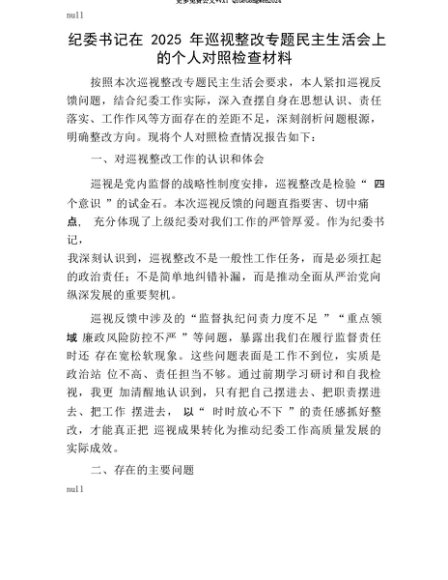 【七哥公文】2025年:【七哥公文】纪委书记在2025年巡视整改专题民主生活会上的个人对照检查材料+更多免费公文+VX:QiGeGongWen2024+更多免费公文+VX:QiGeGongWen2024