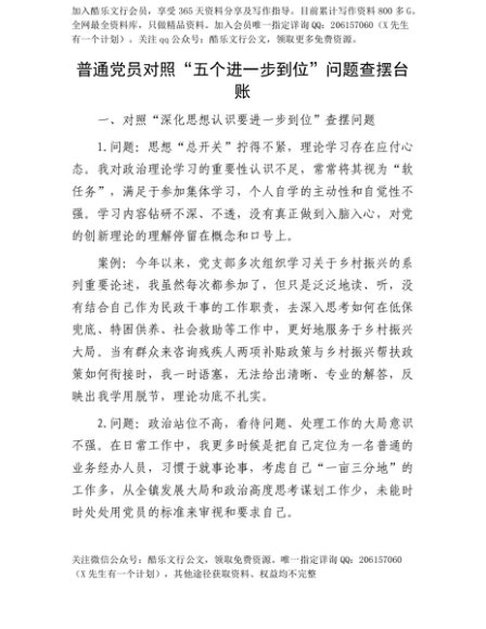 【七哥公文】2025年:【七哥公文】普通X员对照“五个进一步到位”问题查摆台账+更多免费公文+VX:QiGeGongWen2024+更多免费公文+VX:QiGeGongWen2024