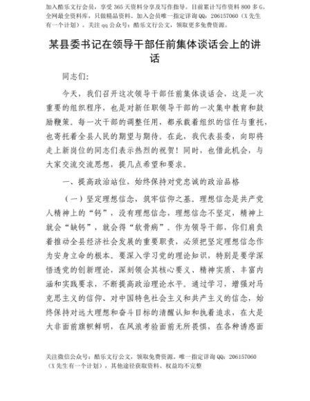【七哥公文】2025年:【七哥公文】某县委书记在领导干部任前集体谈话会上的讲话+更多免费公文+VX:QiGeGongWen2024+更多免费公文+VX:QiGeGongWen2024