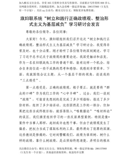 【七哥公文】2025年:【七哥公文】旗妇联系统“树立和践行正确政绩观、整治形式主义为基层减负”学习研讨会发言+更多免费公文+VX:QiGeGongWen2024+更多免费公文+VX:QiGeGongWen2024