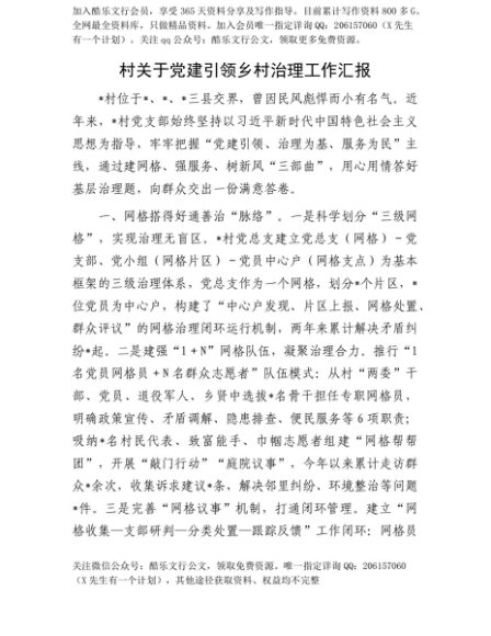 【七哥公文】2025年:【七哥公文】村关于X建引领乡村治理工作汇报+更多免费公文+VX:QiGeGongWen2024+更多免费公文+VX:QiGeGongWen2024