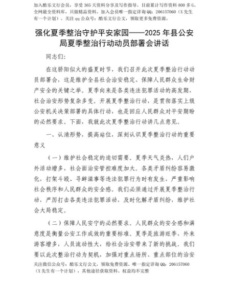 【七哥公文】2025年:【七哥公文】强化夏季整治 守护平安家园——2025年县公安局夏季整治行动动员部署会讲话+更多免费公文+VX:QiGeGongWen2024+更多免费公文+VX:QiGeGongWen2024