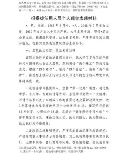 【七哥公文】2025年:【七哥公文】拟提拔任用人员个人现实表现材料+更多免费公文+VX:QiGeGongWen2024+更多免费公文+VX:QiGeGongWen2024