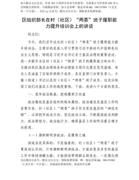 【七哥公文】2025年:【七哥公文】区组织部长在村(社区)“两委”班子履职能力提升培训会上的讲话+更多免费公文+VX:QiGeGongWen2024+更多免费公文+VX:QiGeGongWen2024